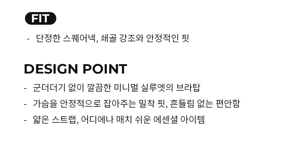 🏷️ 核心設計亮點 (Fit & Design) 1. 俐落方領,顯瘦鎖骨 (Square Neck Fit) 端莊方領設計:大方簡潔的平口方領,能完美襯托鎖骨線條,同時提供極佳的包覆感與穩定度。 2. 細節美學 (Design Point) 極簡主義輪廓 (Minimal Silhouette):乾淨俐落、無多餘贅飾的極簡剪裁,是衣櫃裡最百搭的基礎單品。 穩定貼合感 (Secure Fit):布料緊密服貼,能穩固支撐胸型,即使活動時也完全不晃動,給予十足的安心與舒適感。 極細肩帶 (Slim Strap):細緻的肩帶設計減輕肩部負擔,外搭掛脖上衣或襯衫都非常適合,是完美的疊穿神器。